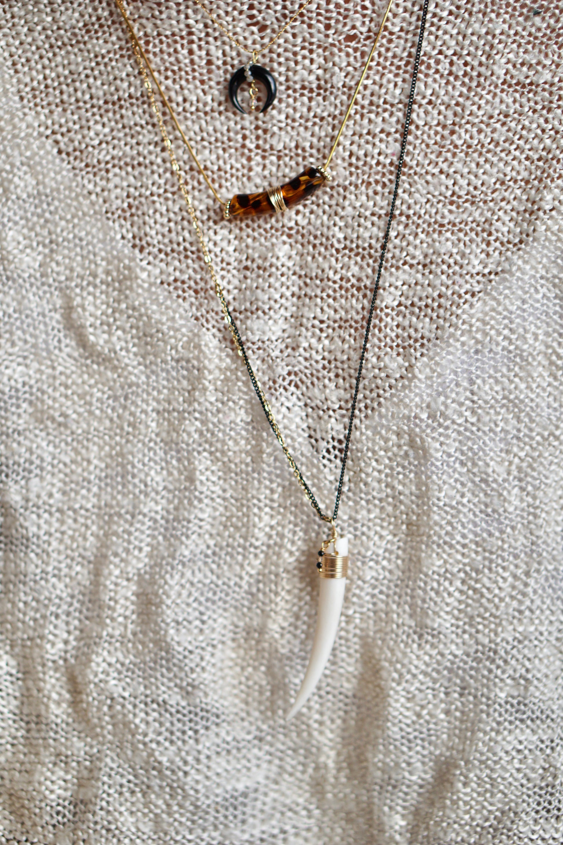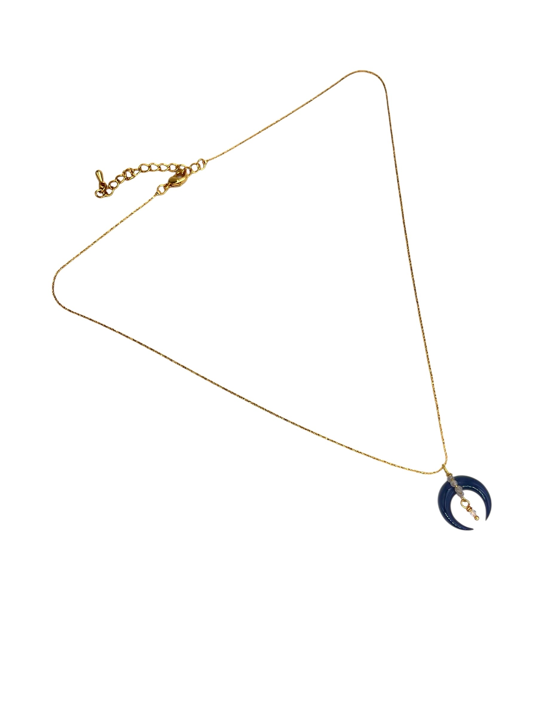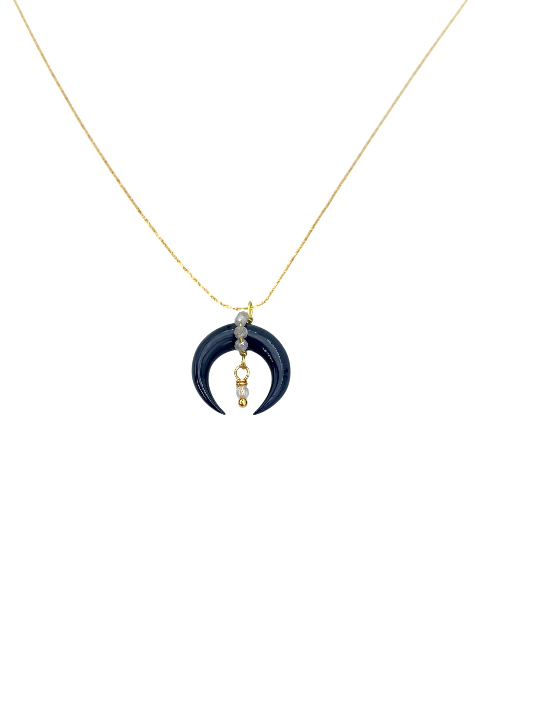 Collier court en laiton plaqué or scintillant, 42cm et chaînette de réglage. Lune en corne et pierres labradorites et quartz fumé et cristal.