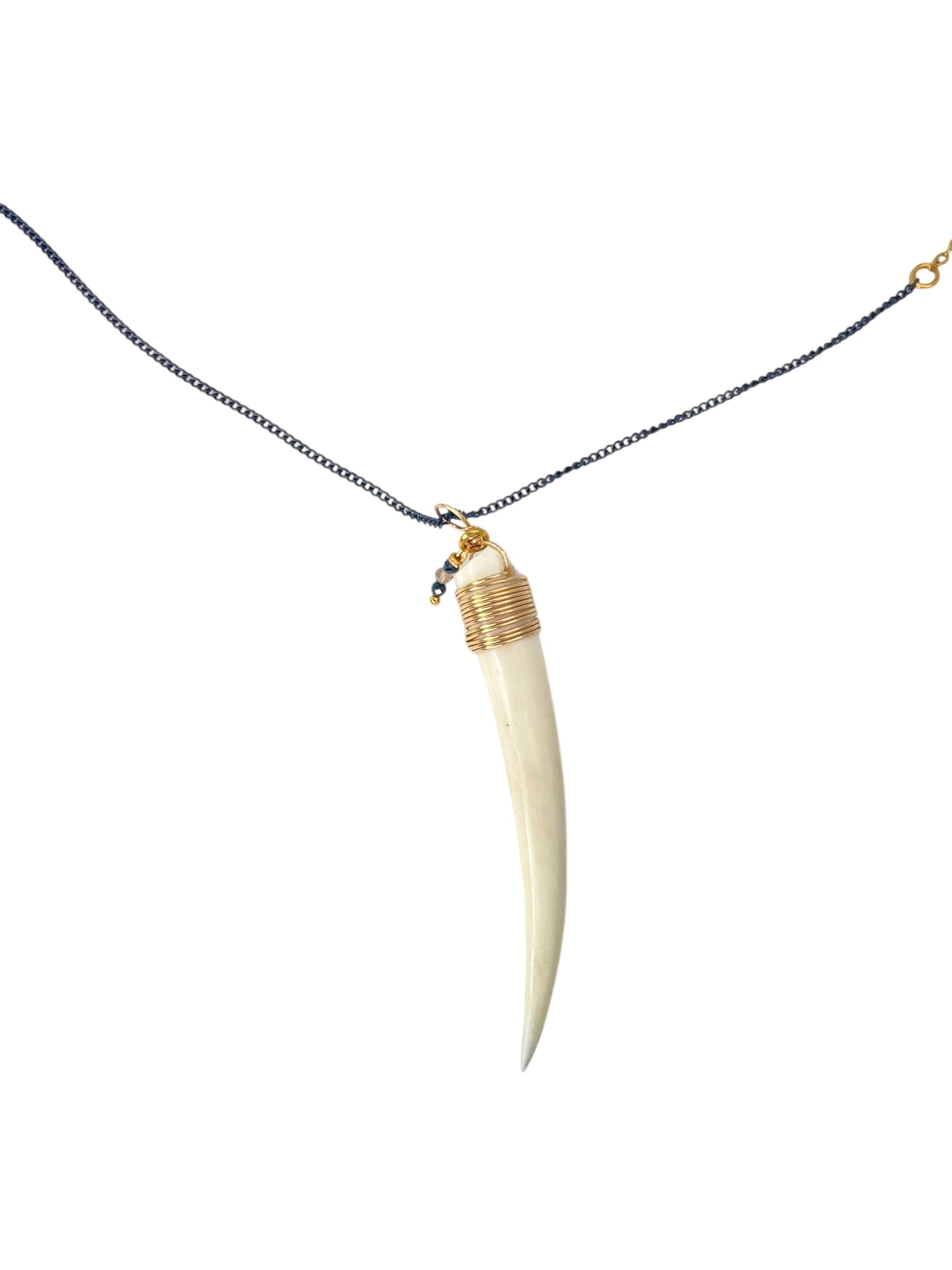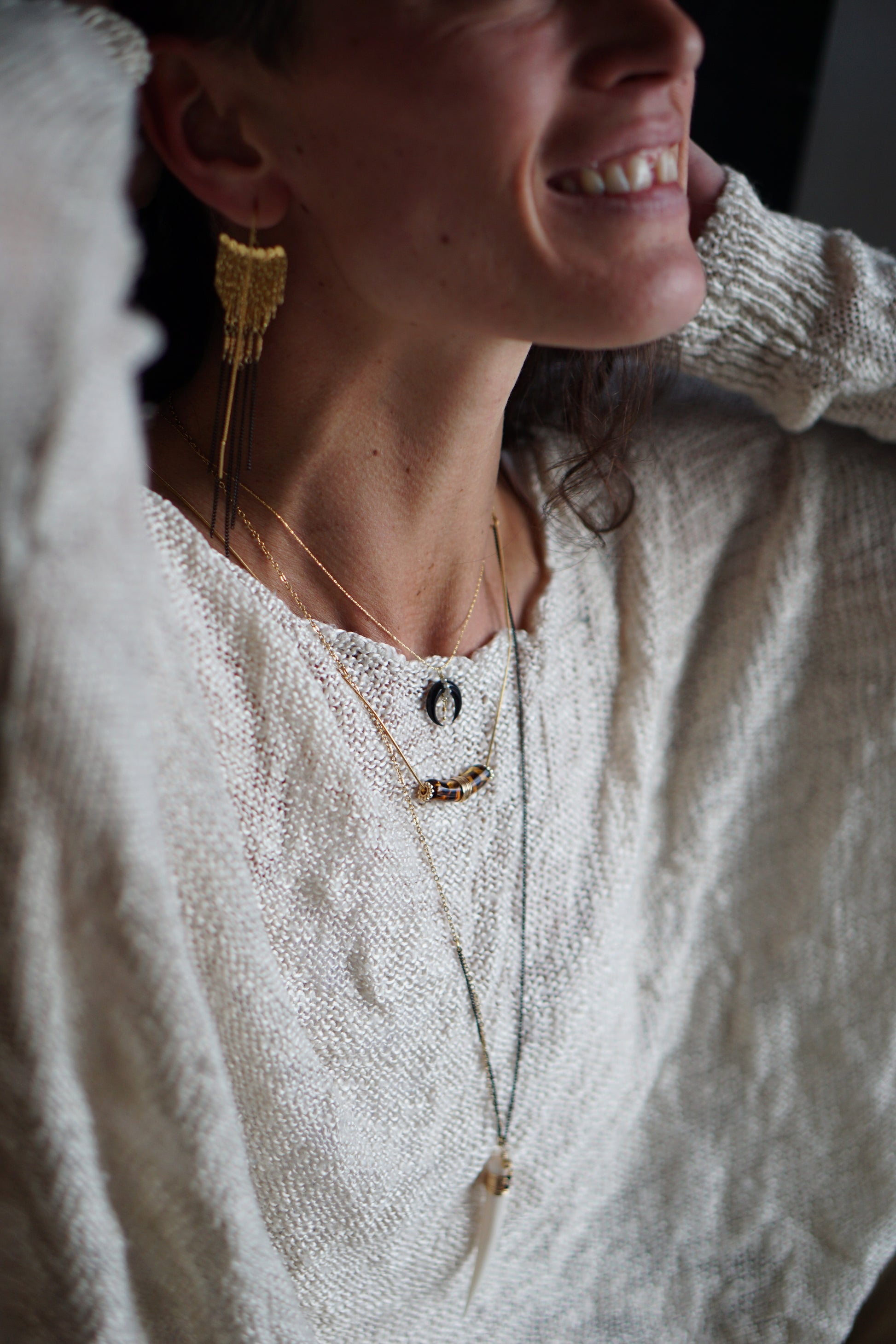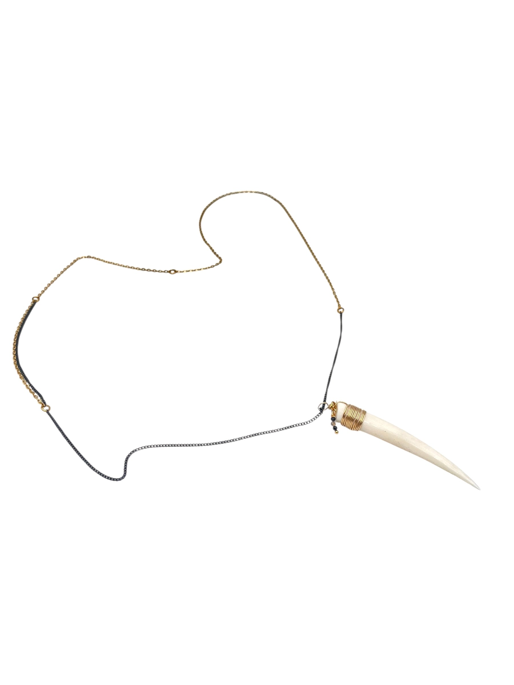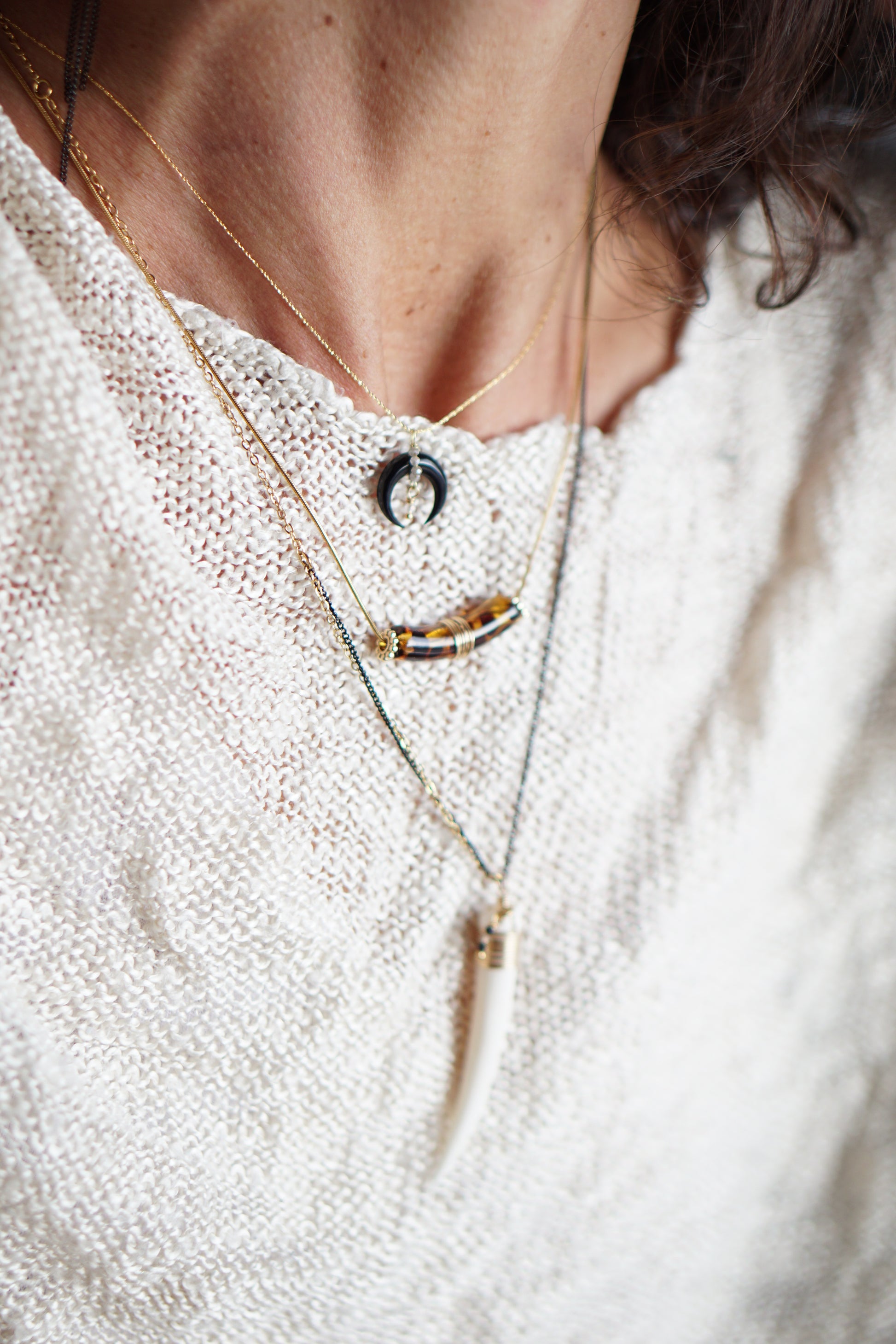 Sautoir. 60cm. Corne de buffle, décoré de goldfilled, spinelle et quartz fumé.