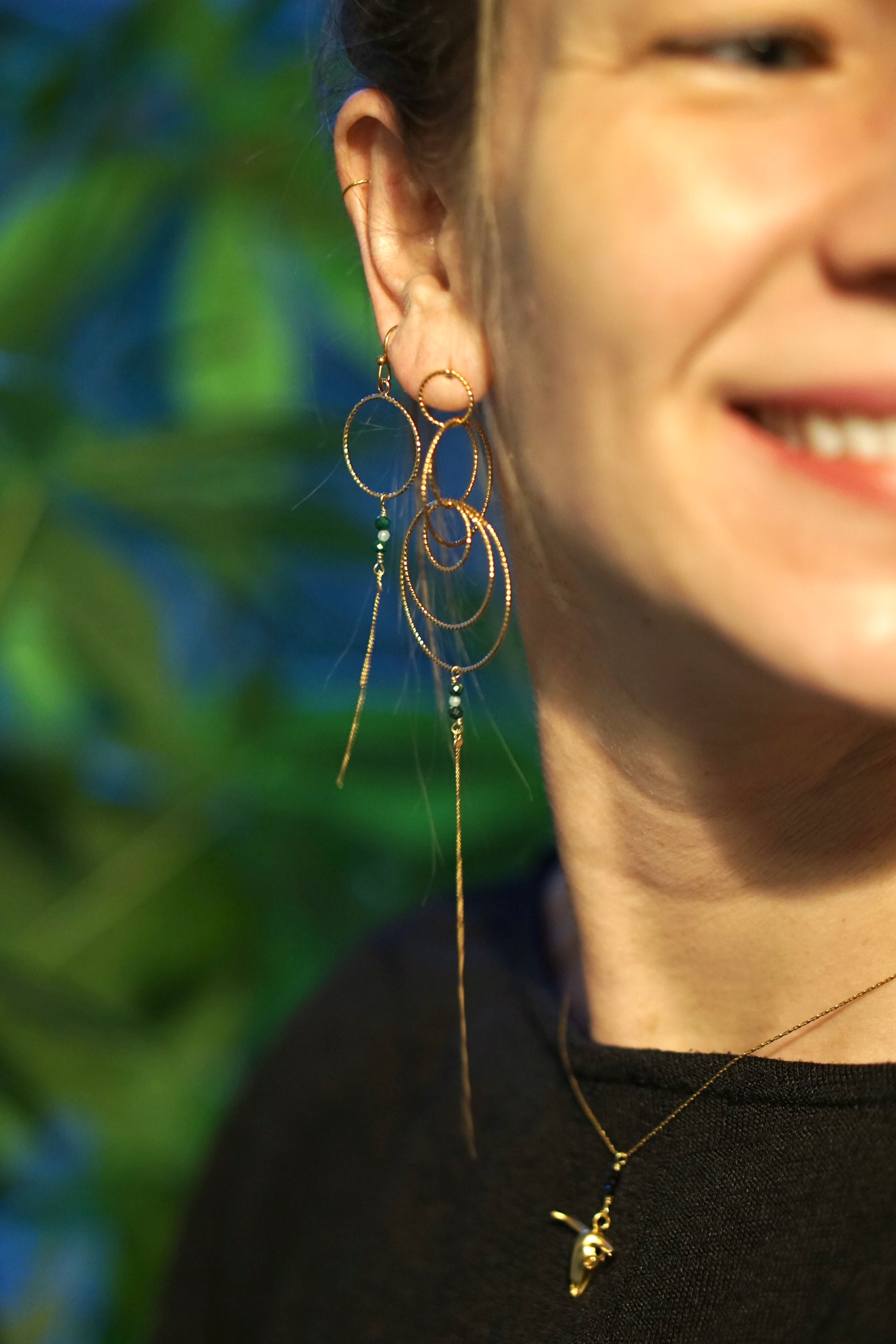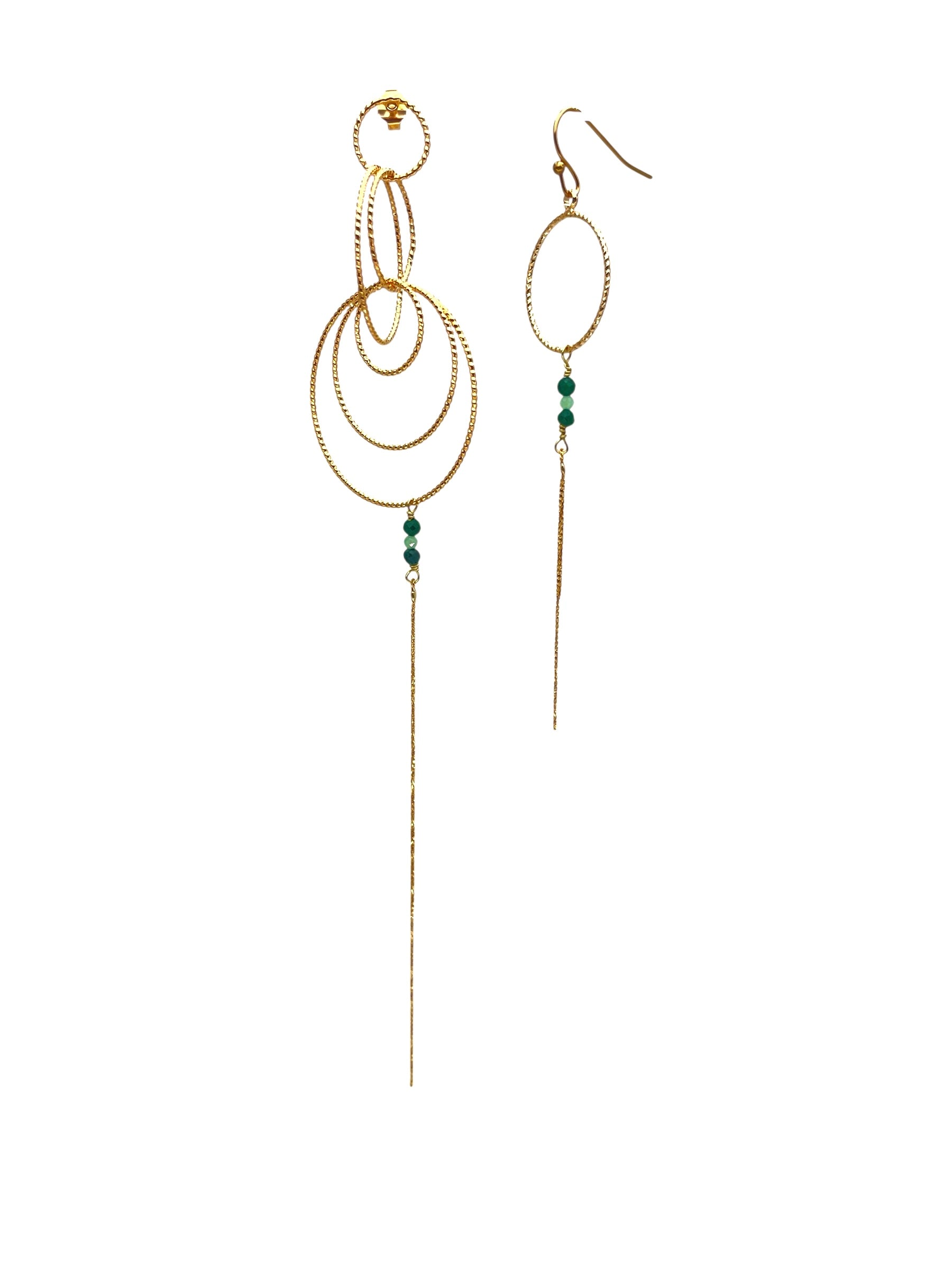 Laiton plaqué or mat. Paire asymétrique. Malachite et émeraude.