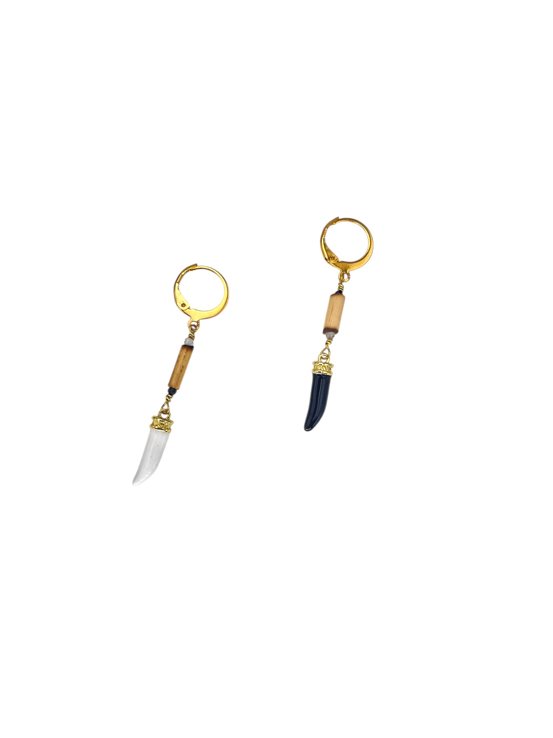 Petite corne céramique et laiton plaqué or, bambou spinelle et cristal. Attache en acier.