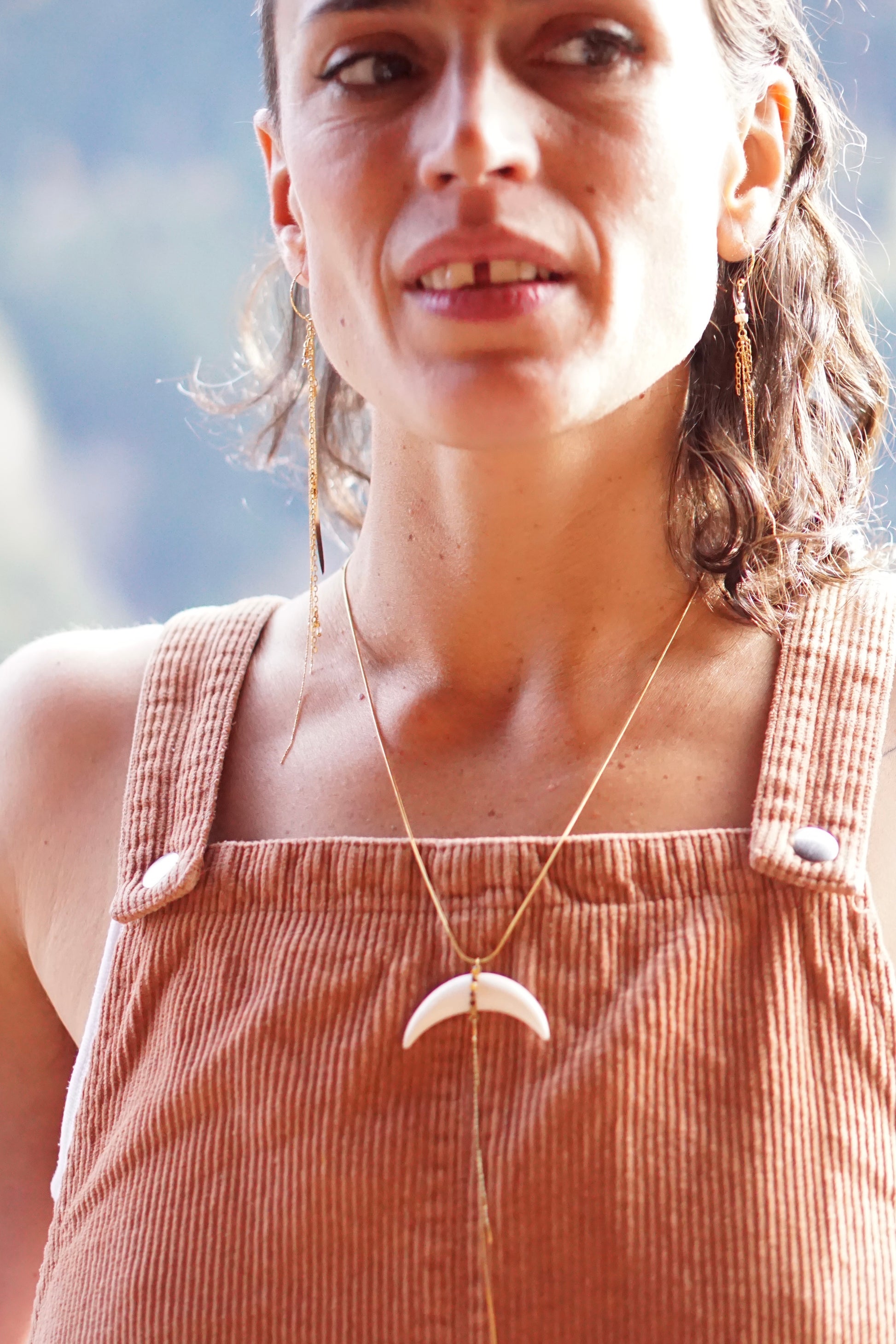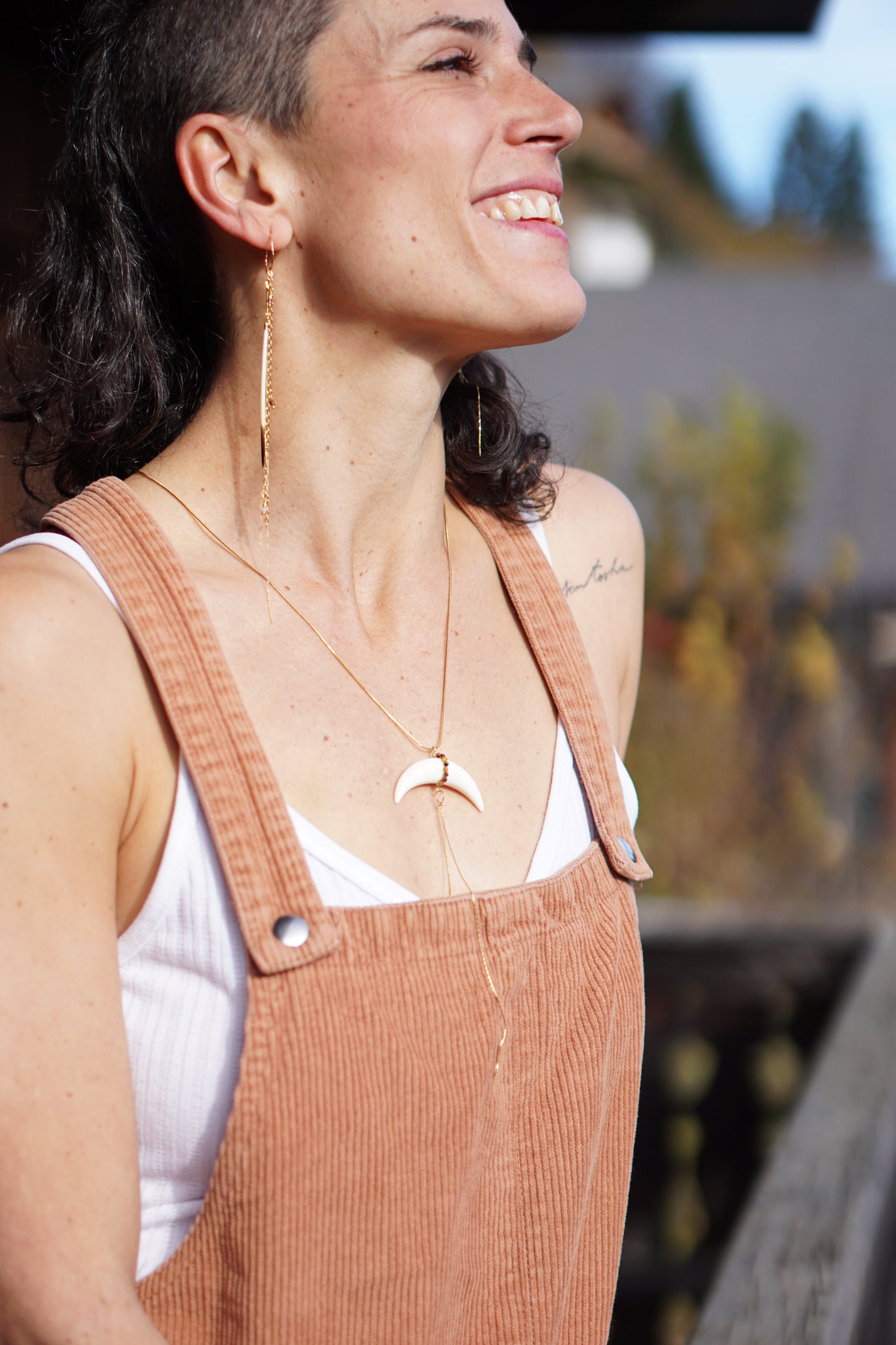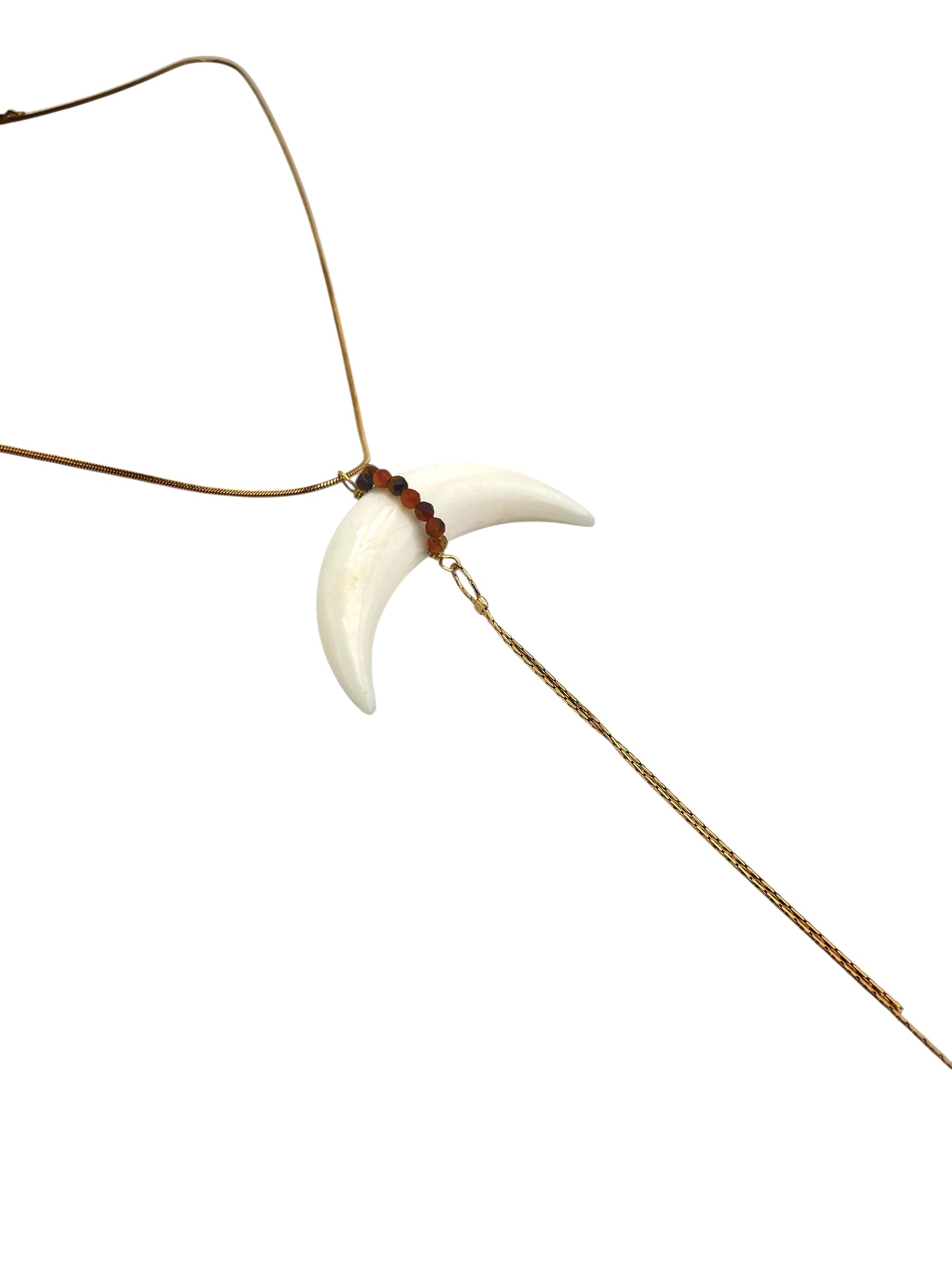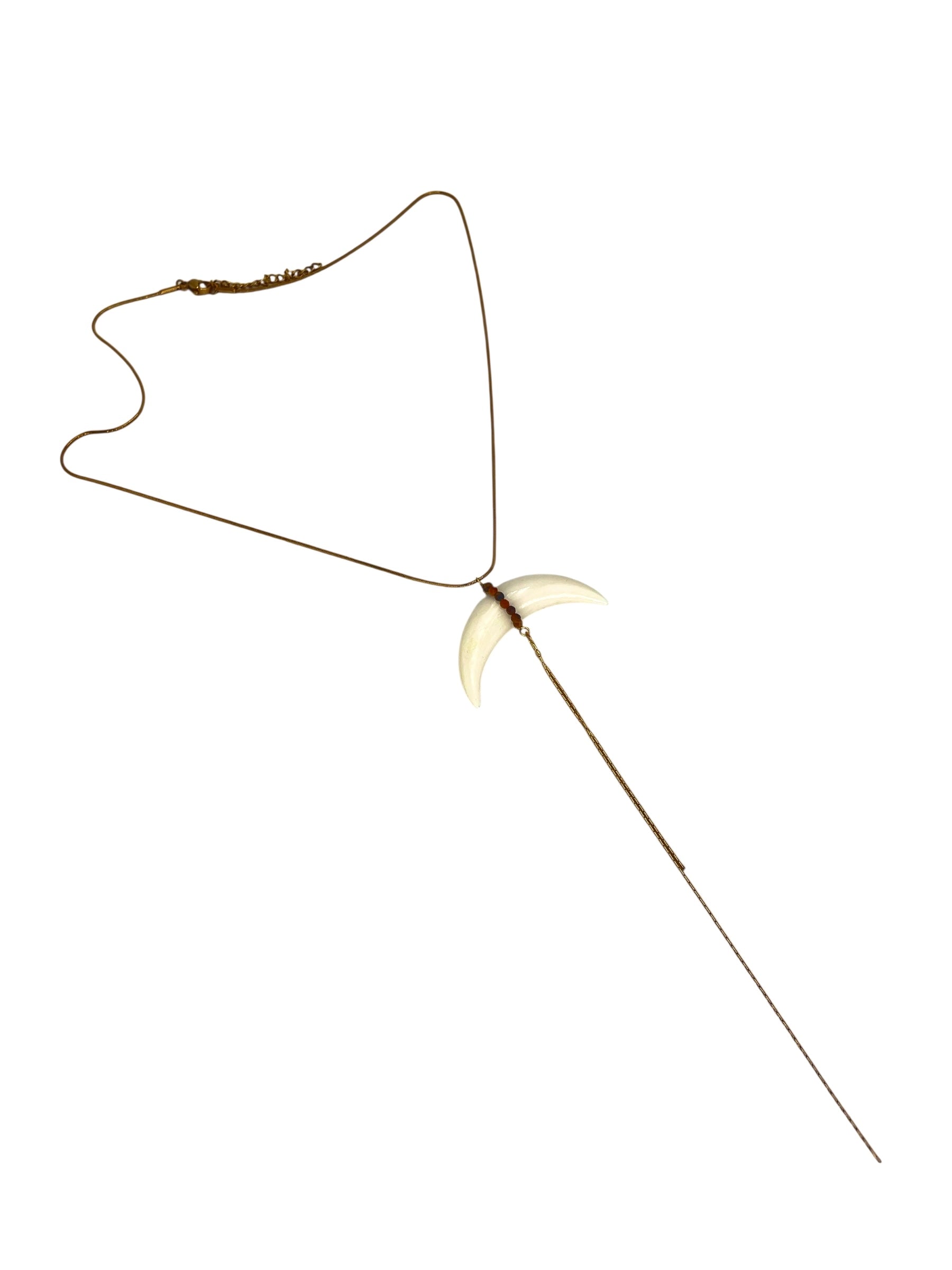 Collier mi long, chaîne en acier doré, corne de buffle et perles d’œil du tigre.