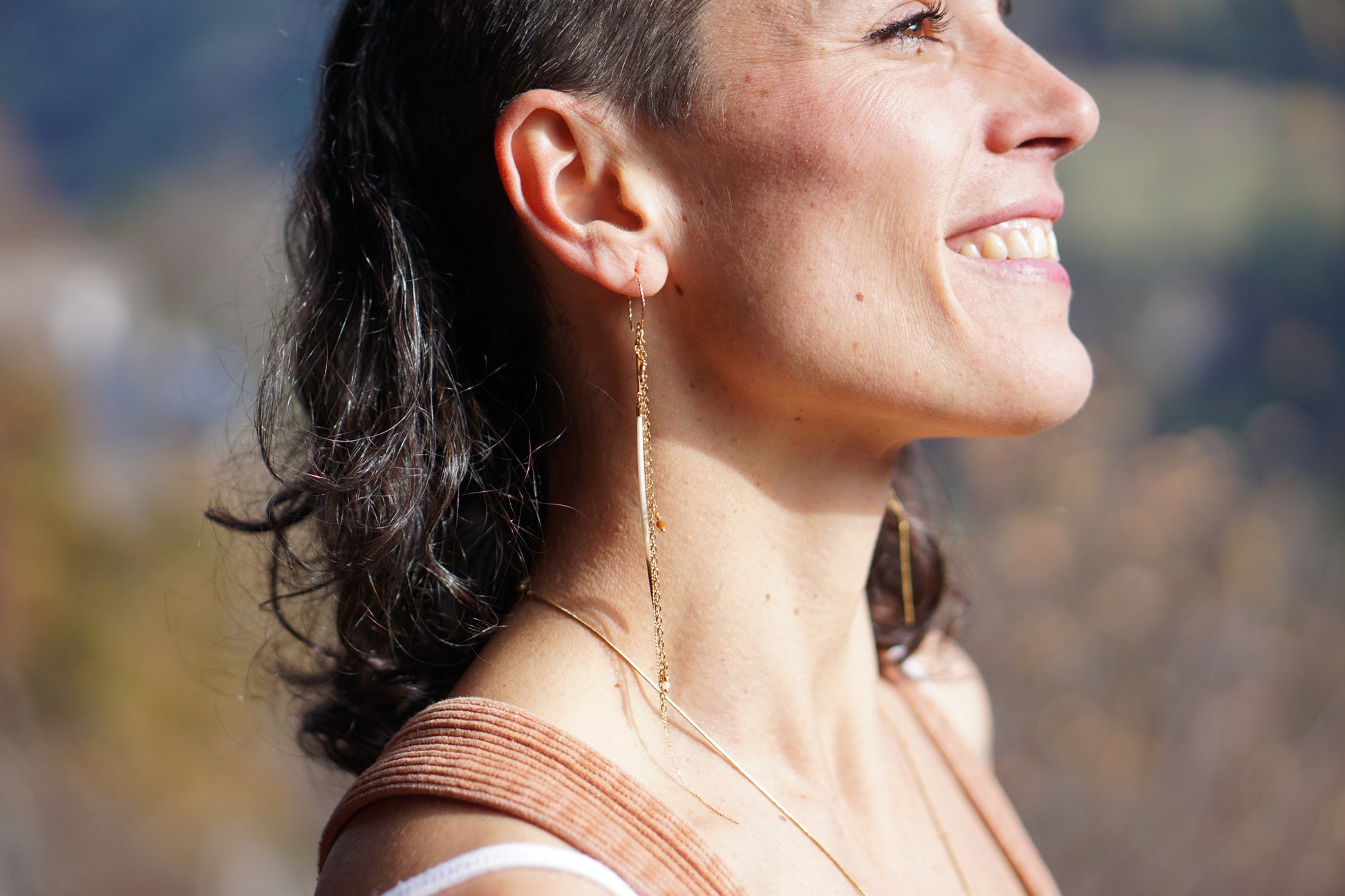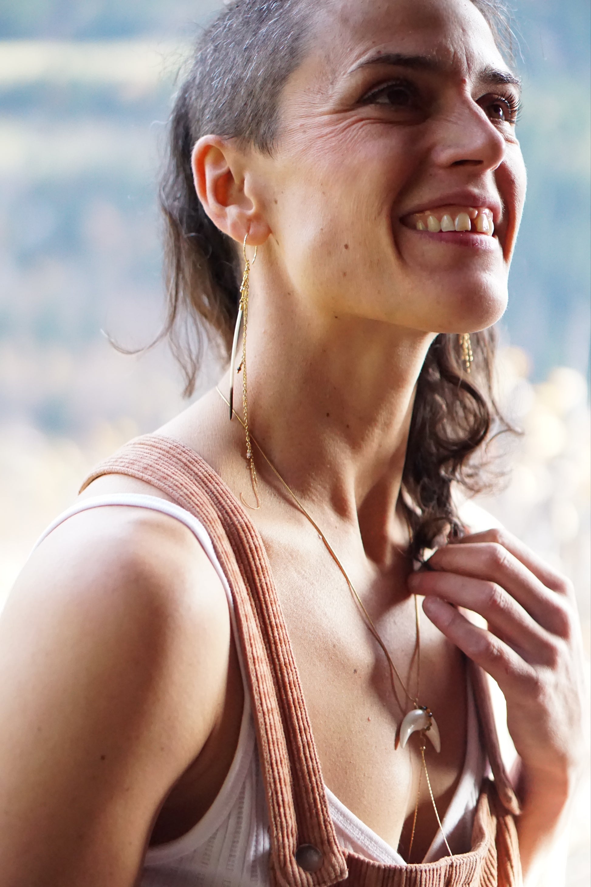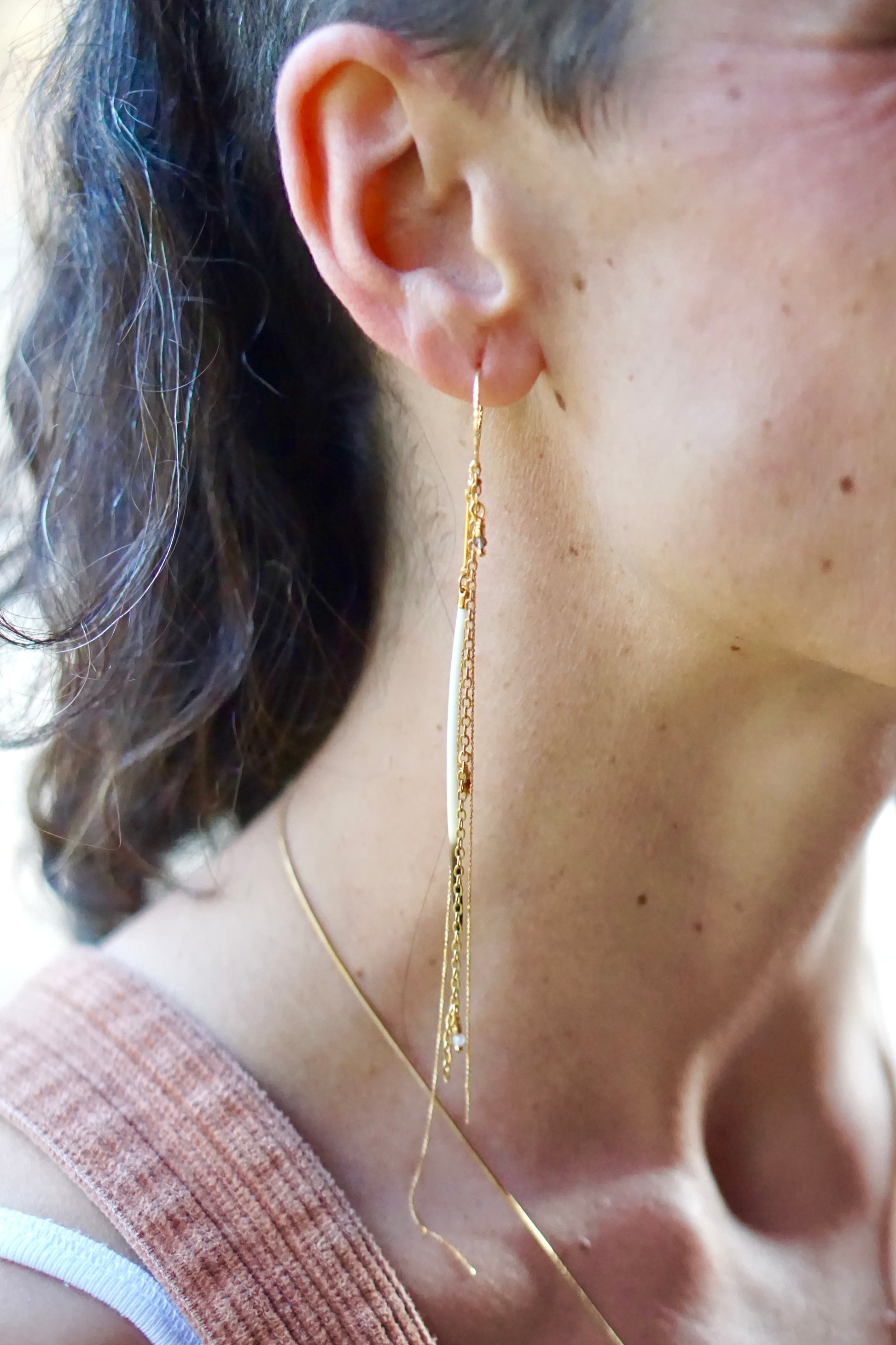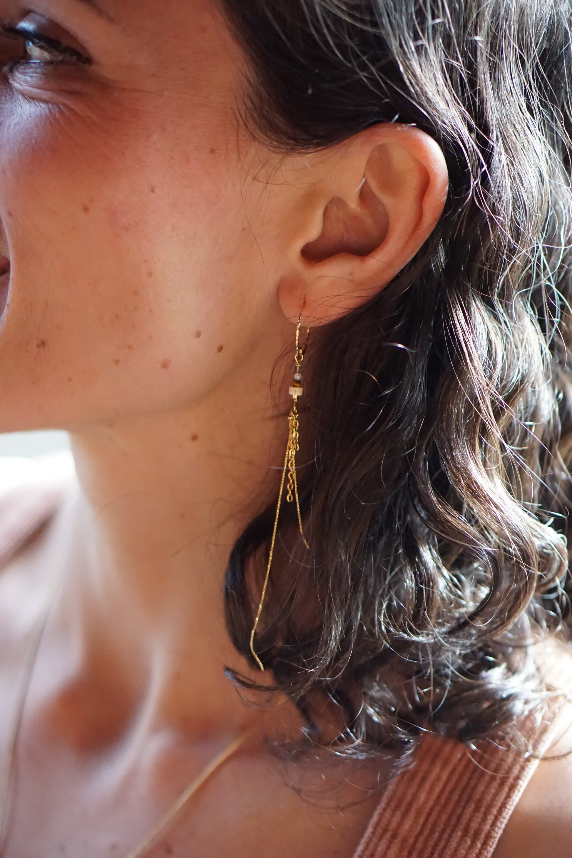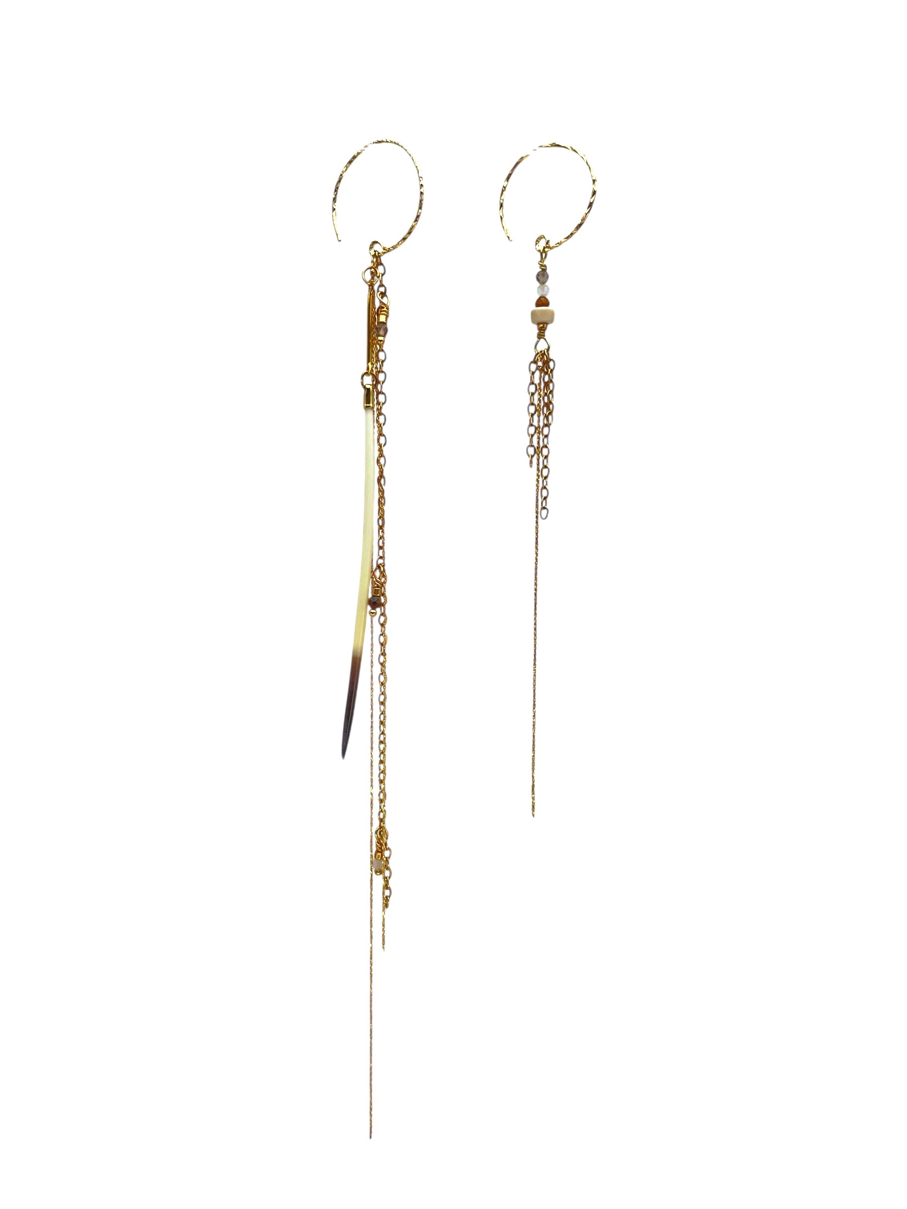 Paire asymétrique. Porc-épic et pierres semi précieuses. Laiton plaqué or. Argenté plaqué or.
