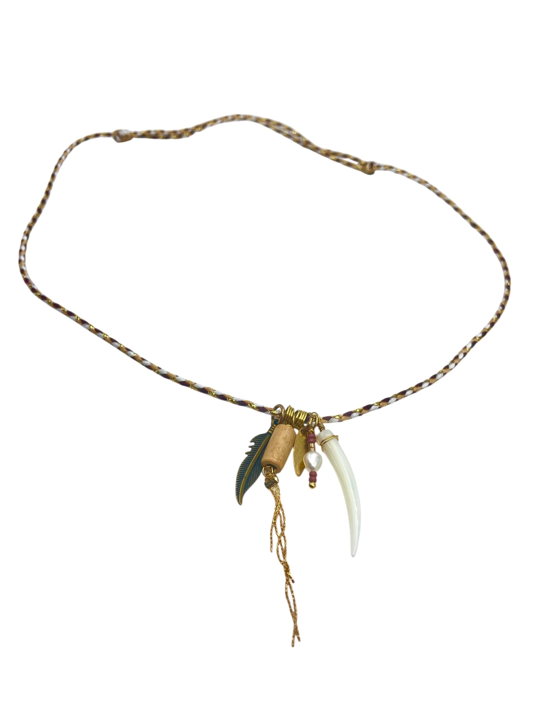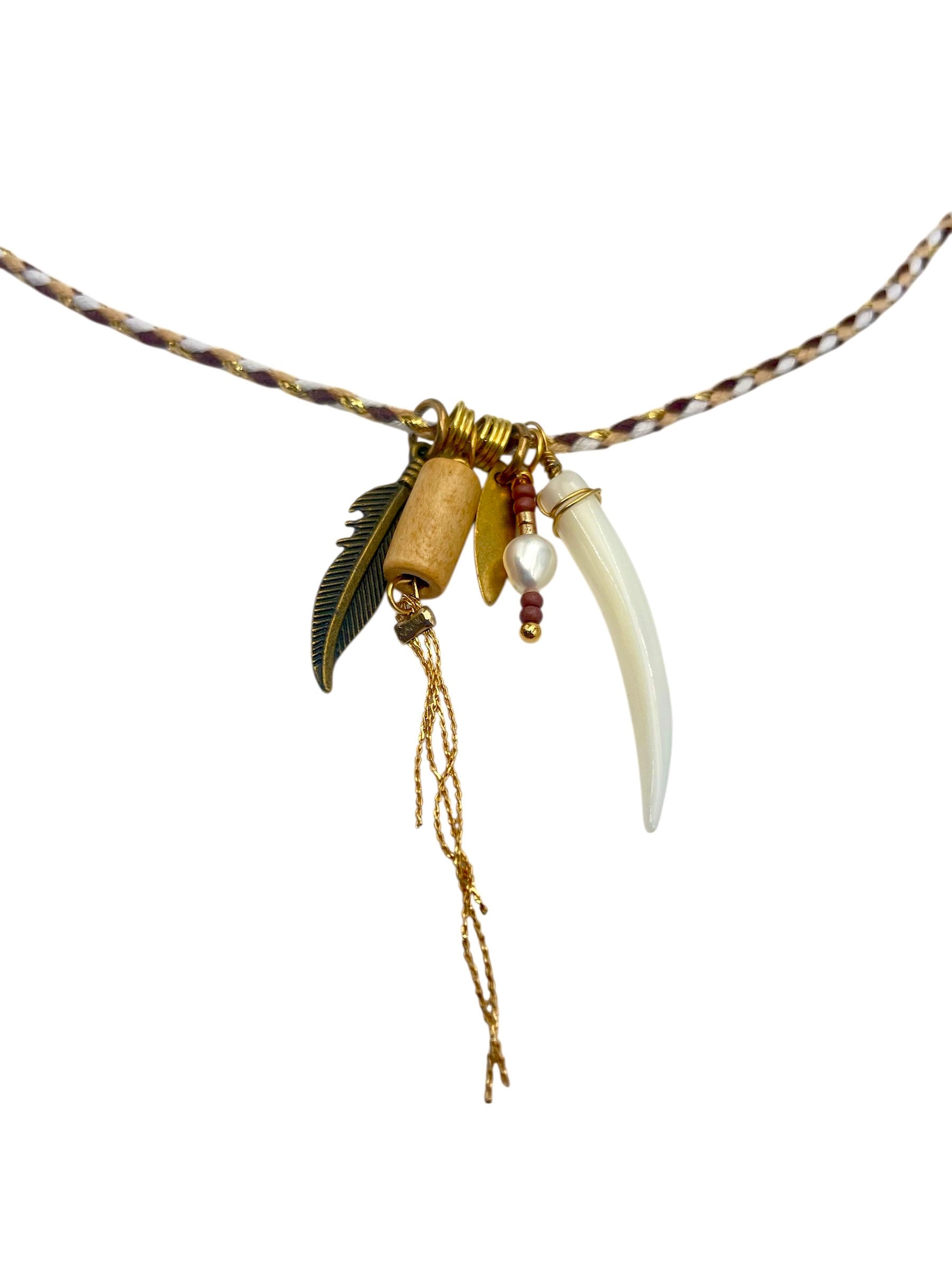 Collier cordon réglable en court ou sautoir. Ton marron et doré.